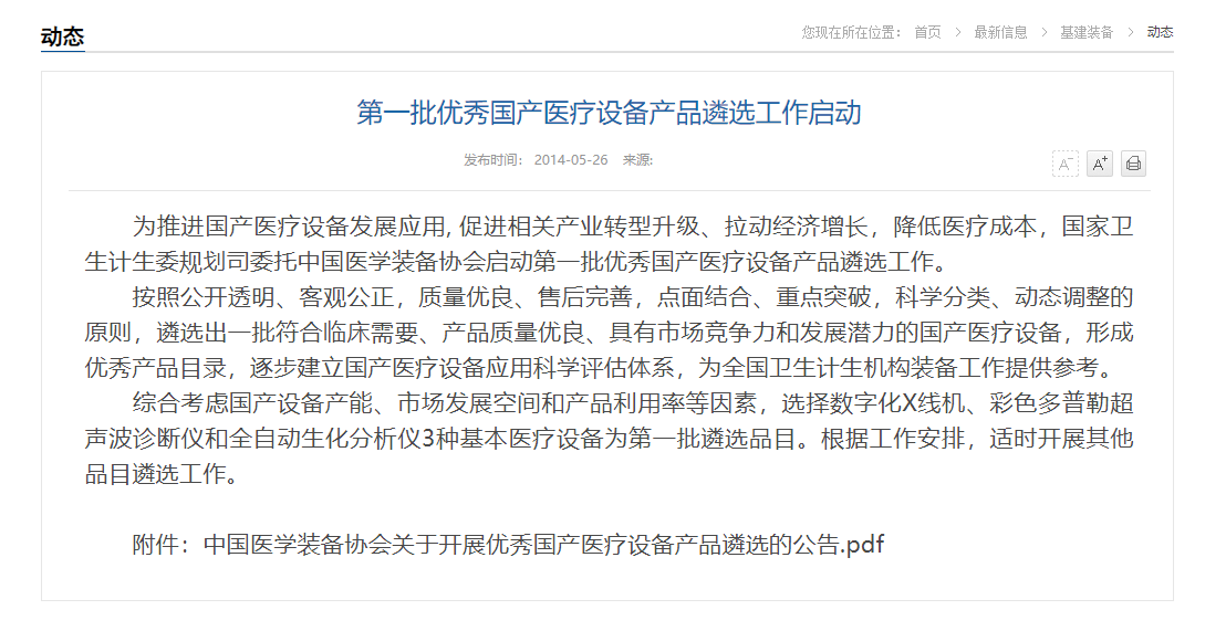 2014年,在习近平总书记上海视察并指出要加快高端医疗设备国产化进程后,国家卫生健康委立即启动了优秀国产医疗设备遴选工作。2014年5月26日晚,卫健委发布公告称,为推进国产医疗设备发展应用,促进相关产业转型升级、拉动经济增长,降低医疗成本,卫计委规划司委托中国医学装备协会启动第一批优秀国产医疗设备产品遴选工作。第一批设备为数字化X光机、彩超、全自动生化分析仪三种。