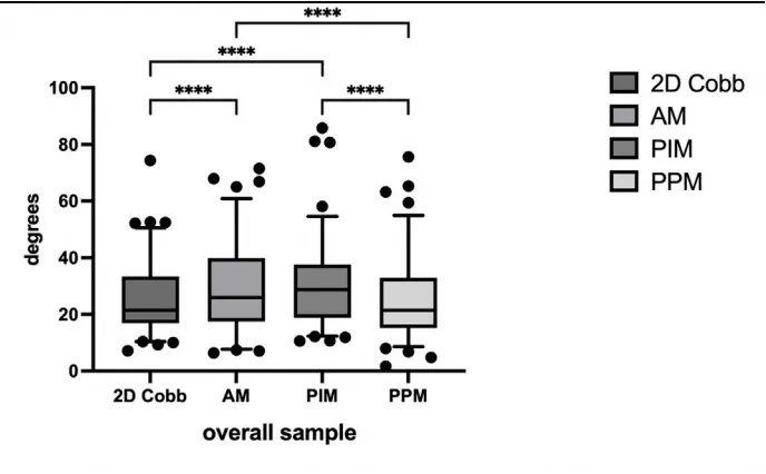 通过测量,三种三维测量方式都体现出了不同的脊柱弯曲评估值,这些差异可能会对临床实践产生重大影响。AM法和PIM法体现了更大的Cobb角数值,有助于更早或更积极的干预AIS;PPM法和二维Cobb角测量值无明显的统计学差异,更适用于AIS的常规监测。因此,在临床应用中应仔细考虑每种模式的成像特征、具体的临床场景以及对患者管理的潜在影响。